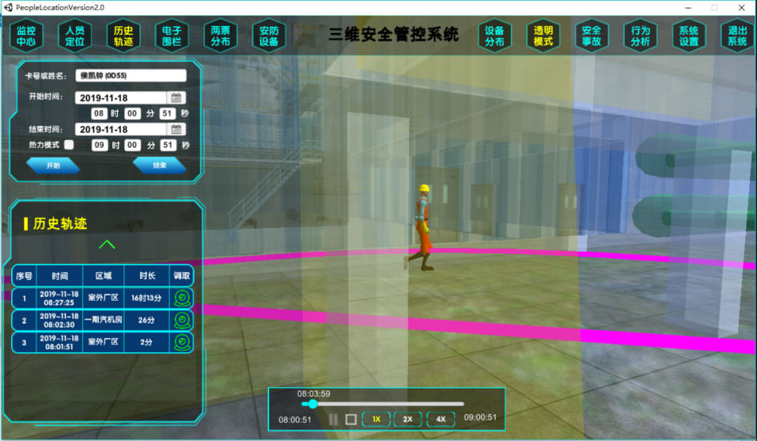 歷史軌跡通過單人、多人以及熱力圖模式對歷史軌跡進(jìn)行查詢。多維度數(shù)據(jù)及查看方式方便變電站管理人員對位置歷史數(shù)據(jù)進(jìn)行有效分析和利用。