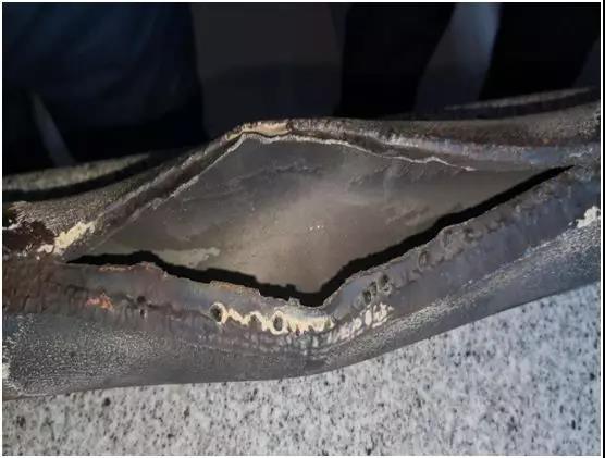 經(jīng)過檢查后發(fā)現(xiàn),造成本次事故的原因是過熱器爆管。流過熱器低溫段左側(cè)第二屏前向后數(shù)第三根管爆管,爆口距頂棚約4米,爆口外表面有長(zhǎng)約200mm、寬約10mm溝痕,厚度1mm溝痕,斷口大部分壁厚小于1毫米。斷管后進(jìn)行通球未發(fā)現(xiàn)異物,調(diào)取2018年10月9日1號(hào)機(jī)組啟動(dòng)以來(lái)壁溫及煙溫曲線,未發(fā)現(xiàn)超溫情況,該管段附近無(wú)吹灰器(排除吹灰器吹損原因)。由于管子爆口下部管段存在明顯減薄缺陷,且原因不清,為進(jìn)一步分析查明爆管及管子減薄缺陷的形成原因,2月18日,將爆管管樣寄至熱工院進(jìn)行檢測(cè)分析。