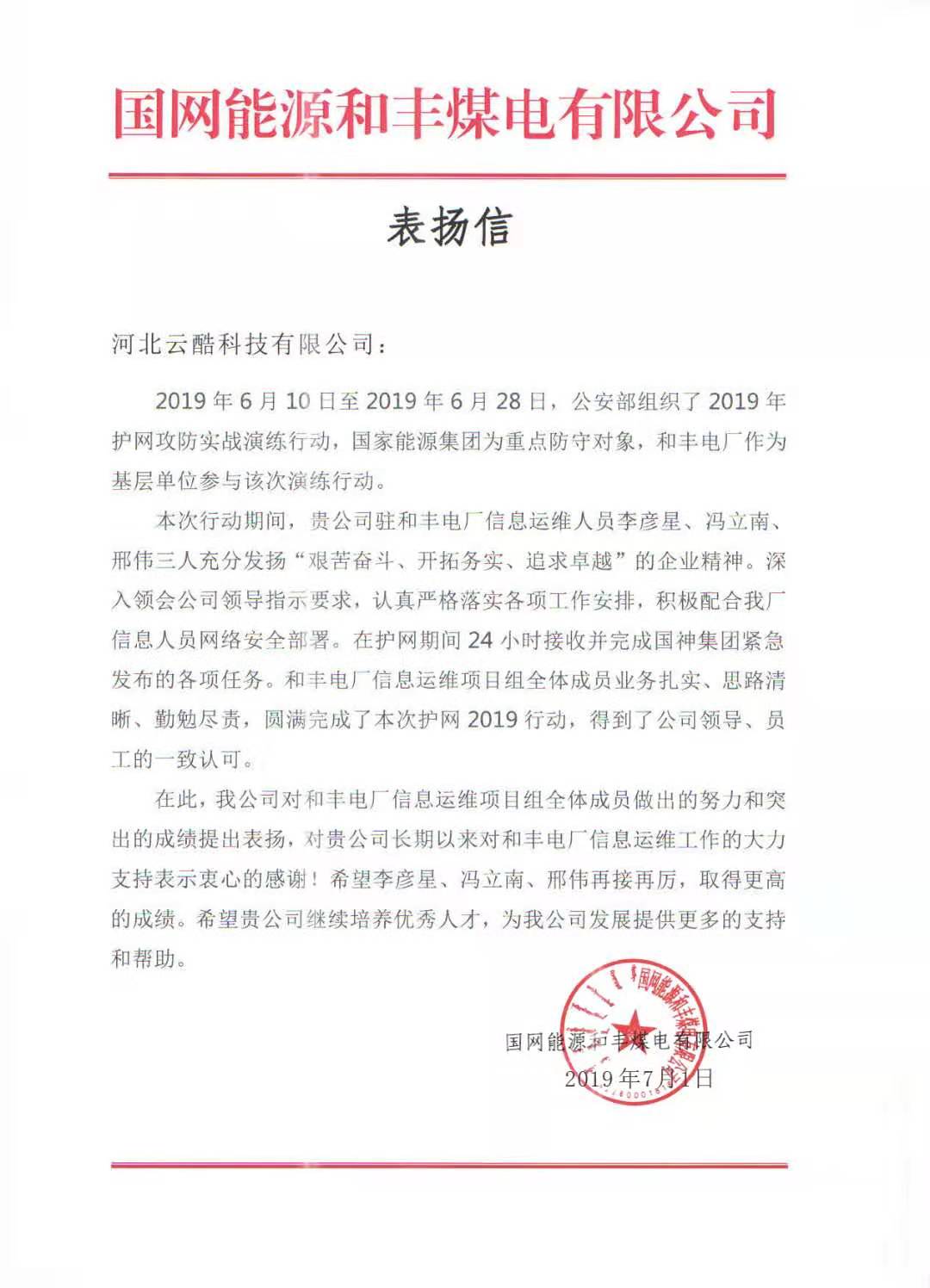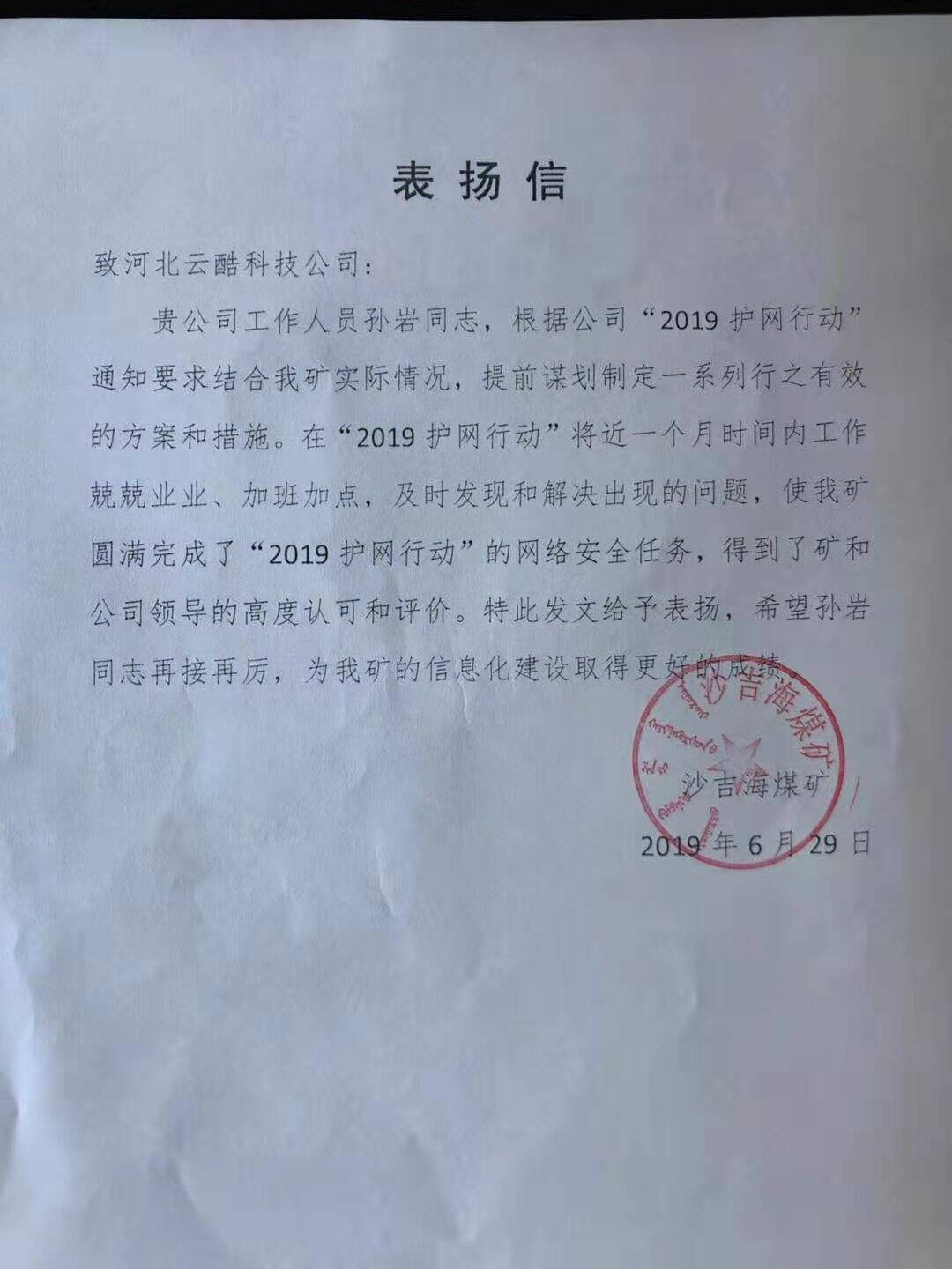 云酷科技運(yùn)維服務(wù)部的四位同事憑借優(yōu)異的技術(shù)實(shí)力和敬業(yè)精神,在本次的演練行動(dòng)中獲得某煤電有限公司的高度贊揚(yáng),并向我司發(fā)來了表揚(yáng)信: